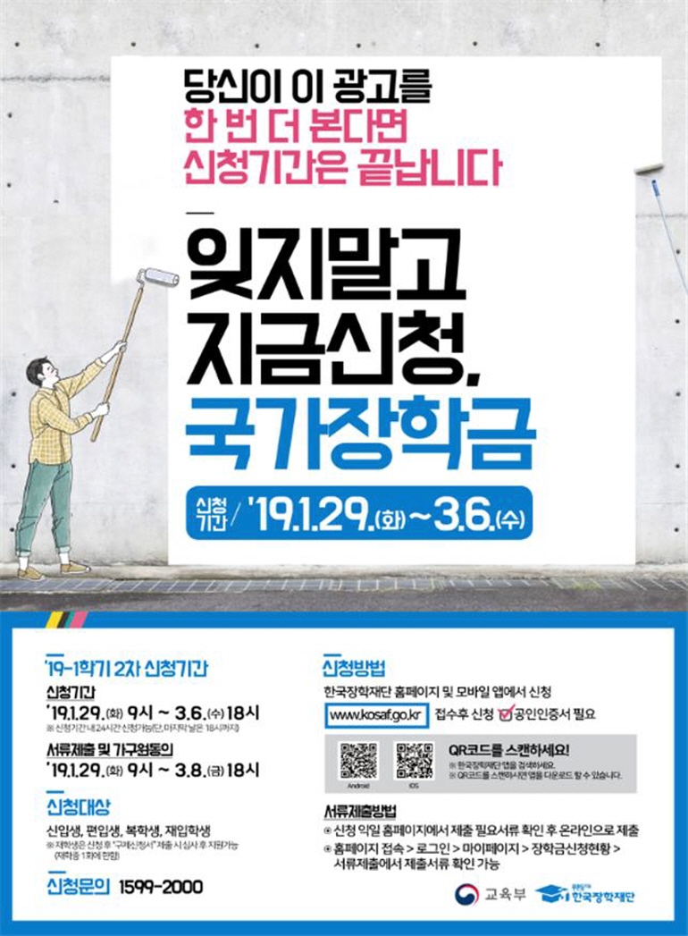 [베리타스알파=유수지 기자] 2019학년 1학기 국가장학금 2차 신청/접수가 29일부터 시작된다. 교육부와 한국장학재단은 국가장학금 2차 신청접수를 29일부터 3월6일까지 37일 동안 실시한다고 25일 밝혔다. 2차 신청은 신/편입/재입학/복학생 대상이다. 1차신청 기간 중 미신청한 재학생의 경우는 구체신청서 제출시, 재학 기간 중 1회에 한해 신청할 수 있다. 신청/접수는 한국장학재단 홈페이지와 모바일앱을 통해 24시간 가능하다. 단 마감일에는 오후6시까지만 접수 가능하니 유의할 필요가 있다. 교육부 관계자는 "마감일에는 신청자가 몰려 홈페이지 접속이 원활하지 않을 수 있으므로 조기신청을 권장한다"고 말했다.