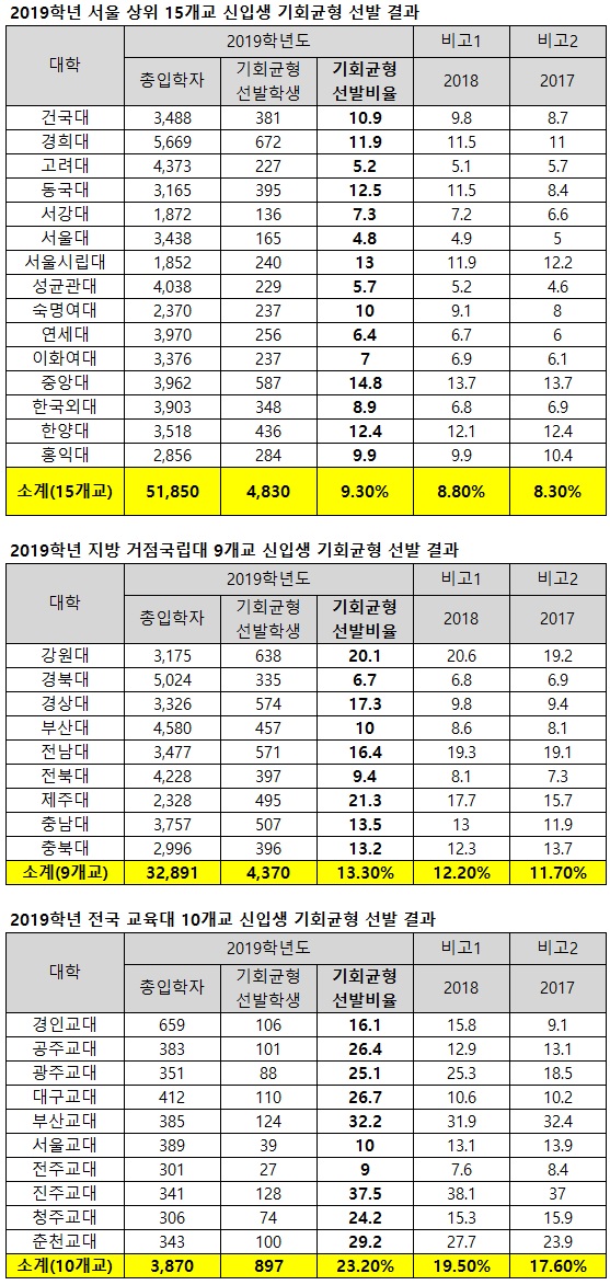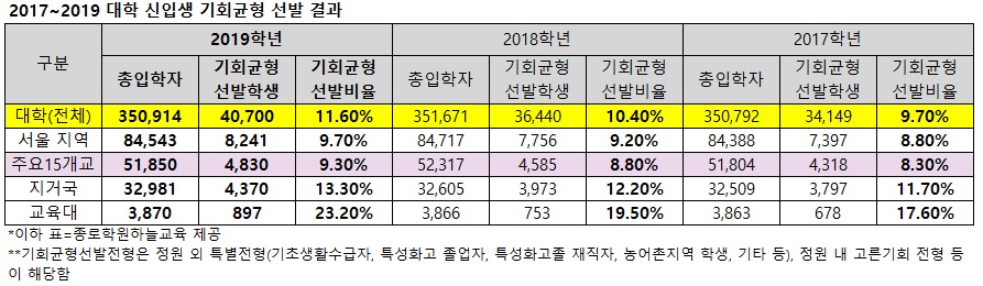 대학알리미 분석 결과, 기균 신입생의 비중은 2011학년 7.7%, 2012학년 7.7%, 2013학년 6.8%, 2014학년 6.8%, 2015학년 8.1%, 2016학년 9.1%, 2017학년 9.7%, 2018학년 10.4%, 2019학년 11.6%의 추이다. 종로학원하늘교육 오종운 평가이사는 "최근 들어 대학 선발에서 공정 가치를 중시하게 되어 기회균형선발 인원이 늘어난 것으로 보이고, 앞으로도 종전보다 공정 입시를 더욱 중시하는 경향으로 이러한 증가 추세는 계속될 것으로 예상된다"고 전했다.