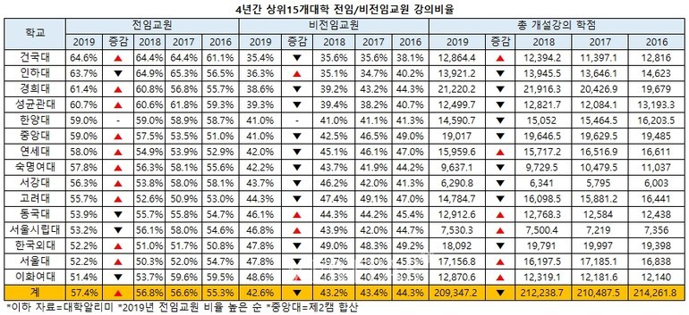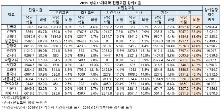 서울대(35.2%) 이화여대(34.2%) 동국대(32.4%) 중앙대(30.7%) 연세대(24.9%) 서울시립대(23.7%) 서강대(23.4%) 고려대(22.9%) 경희대(19.6%) 건국대(18.8%) 인하대(17.2%) 한양대(10%) 숙명여대(5.9%) 성균관대(1.2%) 순이다. 외대 서울대 이대 동대 중앙대가 30%이상의 시간강사/강사 강의비율을 기록한 반면 성대의 시간강사/강사 비율은 1.2%에 불과해 눈길을 끌었다.