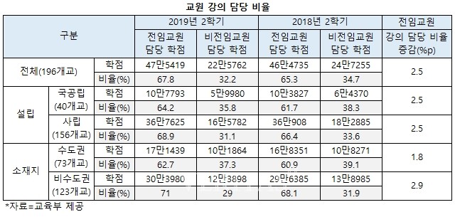전국 4년제 일반대 196개교의 2019년 2학기 전임교원 강의비율은 평균 67.8%로 나타났다. 지난해 같은 시기보다 2.5%p 상승했다. 사립대 전임교원 강의담당비율(68.9%)은 국공립대(64.2%)보다 4.7%p 높았고, 비수도권대학(71%)은 수도권대학(62.7%)보다 8.3%p 높았다.