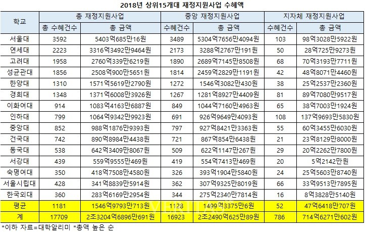 지난해 상위15개대 중 정부와 지자체에서 가장 많은 재정지원을 받은 곳은 서울대였다. 서울대는 3592건의 사업에 선정돼 총 5403억685만16원을 지원받았다. 단일사업으로는 과기정통부에서 지원받은 차세대 탄소자원화 사업이 87억원으로 가장 많았다. 교육부 지원사업중에서는 BK21플러스사업에 선정된 39개사업단이 약 428억원을 지원받았다. 고교교육기여대학사업은 20억6600만원을 지원받았다.