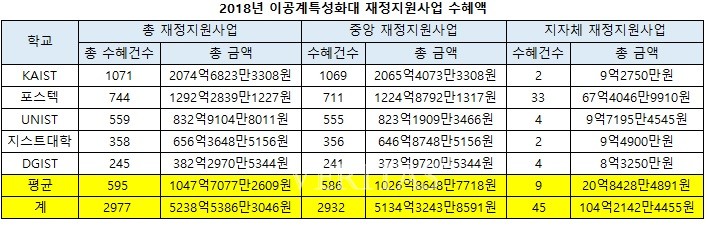 이공계특성화대 중에서는 KAIST의 지원금이 가장 많았다. 1071개사업에서 2074억6823만3308원을 지원받았다. 중앙정부에서 2065억4073만3308원(1069개), 지자체에서 9억2750만원(2개)이었다. 포스텍(1292억2839만1227원) UNIST(832억9104만8011원) 지스트대학(656억3648만5156원) DGIST(382억2970만5344원) 순이었다.