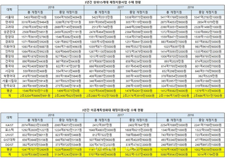 연대(3316억3492만9464원) 고대(2760억339만6219원)가 톱3를 차지했다. 각 2223개, 1958개 사업에 지원을 받았다. 연대는 중앙정부에서 3288억2767만191원(2173개), 지자체에서 28억725만9273원(50개)을 지원받았고, 고대는 중앙정부에서 2689억7145만8508원(1890개), 지자체에서 70억3193만7711원(68개)을 지원받았다. 고대의 경우 전년에 비해 지원금이 247억원 늘어 증가폭이 가장 컸다.