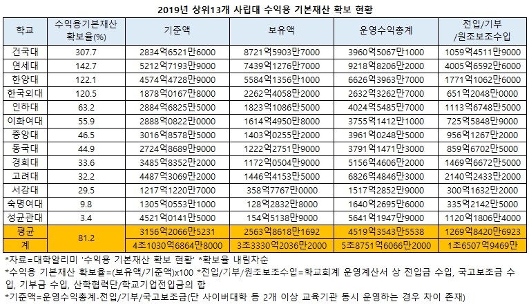 상위13개 사립대 가운데 기준액 이상의 수익용 재산을 확보한 대학은 건대를 포함해 연대 한대 한국외대로 총 4개교였다. 연대는 기준액 5212억7193만9000원에 보유액 7439억1276만7000원(142.7%), 한대는 기준액 4574억4728만9000원에 보유액 5584억1356만1000원(122.1%), 한국외대는 기준액 1878억0167만8000원에 보유액 2262억4058만2000원(120.5%)으로 나타났다.