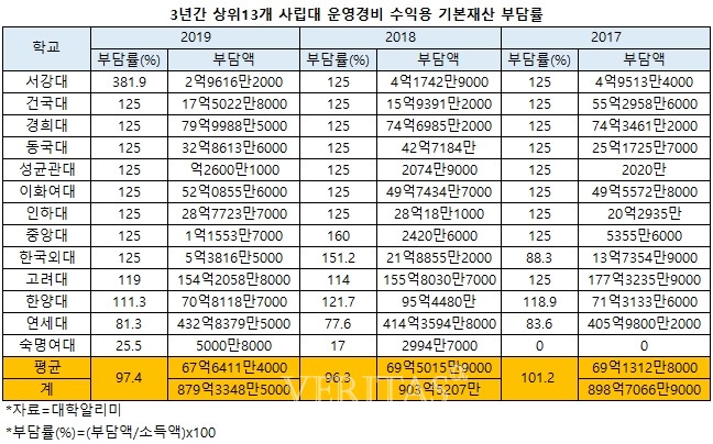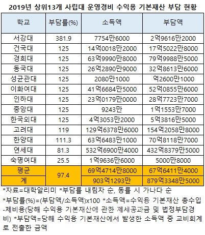 상위13개 사립대 대부분은 수익용 기본재산에서 발생한 소득을 규정에 따라 대학 운영경비에 쓰고 있는 것으로 나타났다. 13개대학 중 11곳이 소득액보다 많은 금액을 교비회계로 전출했다. ‘대학설립/운영 규정’에 따르면 대학 법인은 매년 수익용 기본재산에서 생긴 소득의 80%를 대학운영에 필요한 경비로 충당해야 한다. 수익용 기본재산에서 얻은 소득을 학교 운영 경비에 부담한 비율은 서강대가 381.9%로 가장 높았다. 건대/경희대/동국대/성균관대/이대/인하대/중앙대/한국외대(각 125%) 고대(119%) 한대(111.3%) 연대(81.3%) 숙대(25.5%) 순이다.