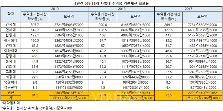 [베리타스알파=강태연 기자] 상위13개 사립대 가운데 올해 수익용 기본재산 확보율이 가장 높은 곳은 건국대였다. 건대는 기준액 2834억6521만6000원의 3배가 넘는 8721억5903만7000원의 수익용 기본재산을 확보해 확보율 307.7%를 기록했다. 톱3를 차지한 연세대(142.7%) 한양대(122.1%)보다 독보적으로 높은 수치다.