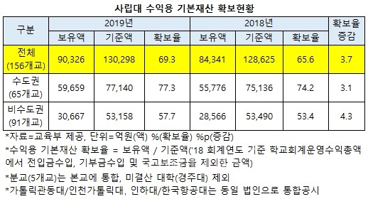 올해 전국 156개 사립대의 수익용 기본재산 확보율은 69.3%다. 지난해 65.6%보다 3.7%p 상승했다. 수익용 기본재산은 약 9조원으로 지난해 8.4조원보다 6000억원 증가했다. 지역별로 보면 수도권(65개교)이 77.3%로 지난해 74.2%보다 3.1%p, 비수도권대학(91개교)은 57.7%로 지난해 53.4%보다 4.3%p 상승했다.