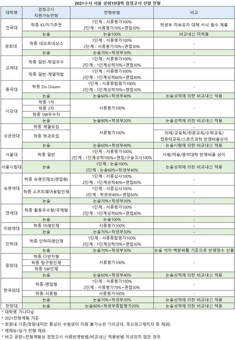 2021전형계획 기준, 검정고시생이 지원가능한 학생부 전형은 건국대(학종 KU자기추천) 경희대(학종 네오르네상스) 고려대(학종 일반 학업우수, 계열적합) 동국대(학종 Do Dream) 서강대(학종 1,2차/SW우수자) 성균관대(학종 계열모집, 학과모집) 서울대(학종 일반) 숙명여대(학종 숙명인재Ⅱ(면접형), 학종 소프트웨어융합인재) 연세대(학종 활동우수형/국제형) 이화여대(학종 미래인재) 인하대(학종 인하미래인재) 중앙대(학종 다빈치형, 탐구형인재, SW인재) 한국외대(학종) 등이다. 교과전형 없이 모두 학종 전형이다. 학종은 서류종합평가로 진행되는 것이 일반적이다. 자소서를 요구하거나 추천서를 함께 활용하는 경우가 대부분이지만, 건대처럼 대체 서식 자료를 요구하는 등 대학별 제출사항이 존재할 수도 있다. 대학마다 비교내신 활용 비율 등도 다르기 때문에, 추후 수시요강을 통해 공개되는 전형요소 등을 꼼꼼히 확인할 필요가 있다. 현재 전형계획상에서는 구체적인 비율이 확인할 수 없는 경우가 대부분이다.