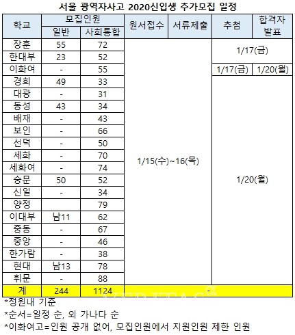 서울 광역자사고 20개교는 일반244명 사회통합1124명을 추가모집한다. 일반전형 모집을 실시하는 곳은 장훈(55명) 숭문(50명) 경희(49명) 동성(43명) 한대부(23명) 현대(남13명) 이대부(남11명) 총 7개교다. 사회통합의 경우 20개교 모두 모집을 실시한다. 사회통합전형 추가모집인원이 가장 많은 곳은 휘문고로 88명을 모집한다. 이어 양정79명 현대78명 세화여74명 장훈72명 세화70명 중동67명 보인66명 이대부62명 이화여55명 한대부52명 숭문52명 선덕50명 중앙46명 배재43명 한가람38명 동성34명 신일34명 경희33명 대광31명 순이다. 이화여의 경우 별도의 모집인원을 공개하지 않아 모집요강에 나온 모집인원에서 지난해 12월 지원자 수를 제한 인원이다.