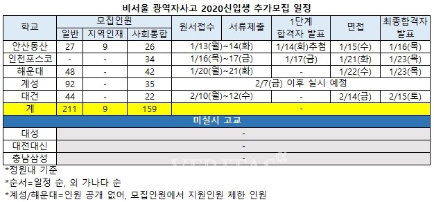 비서울 광역자사고의 추가모집 접수는 고교별로 차이가 있다. 안산동산의 경우 이미 14일까지 원서접수를 실시했다. 인천포스코는 16~17일, 해운대 20~21일, 대건 내달 10일~12일까지 원서접수 기간이다. 계성의 경우 내달 7일 이후 추가모집 일정이 시작될 예정이다. 안산동산을 제외하고 1단계 합격자 발표는 인천포스코만 실시하며 17일 홈페이지를 통해 공지한다. 면접은 인천포스코 21일, 해운대 22일, 대건 내달 14일 실시한다. 최종합격자는 인천포스코 해운대 23일, 대건 내달 15일 홈페이지를 통해 공지한다.