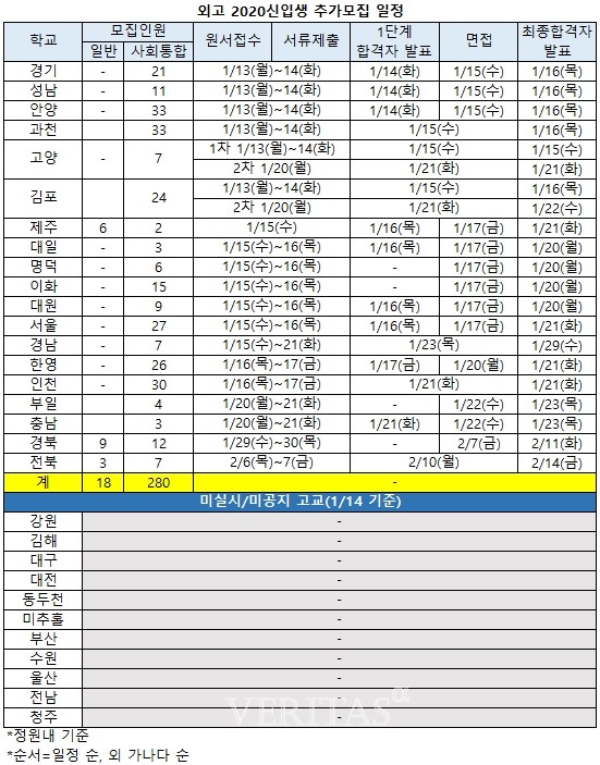 외고 30개교 중 14일 기준 추가모집 관련 공지가 확인된 곳은 경기 성남 안양 과천 고양 김포 제주 대일 명덕 이화 대원 서울 경남 한영 인천 부일 충남 경북 전북으로 총 19개교다. 미추홀 수원 청주의 경우 지난해 12월 실시한 신입생 모집에 모든 전형에 모집인원이 충원됐다. 외에 강원 김해 대구 대전 동두천 부산 울산 전남의 경우 요강상 추가모집 일정을 공개했더라도 아직 공지는 나오지 않았다.