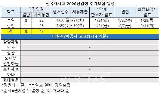 14일 기준 전국자사고의 경우 10개교 중 북일과 김천만 추가모집 관련 공지를 게시했다. 북일은 일반8명 사회통합22명, 김천은 사회통합25명이다. 외에 8개교 중 상산 광철 포철은 사회통합전형에서 미달을 기록했지만 아직 추가모집 공지는 올라오지 않은 상태다.