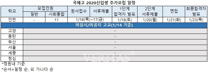 국제고의 경우 인천만 신입생 추가모집 일정을 공지한 것으로 나타났다. 사회통합11명을 모집한다. 서울 고양 부산 동탄의 경우 모든 인원이 지난해 모집에서 충원됐다. 외에 세종은 사회통합전형에서 미달된 인원인 6명에 대한 추가모집 원서접수를 6일부터 7일까지 진행했다.