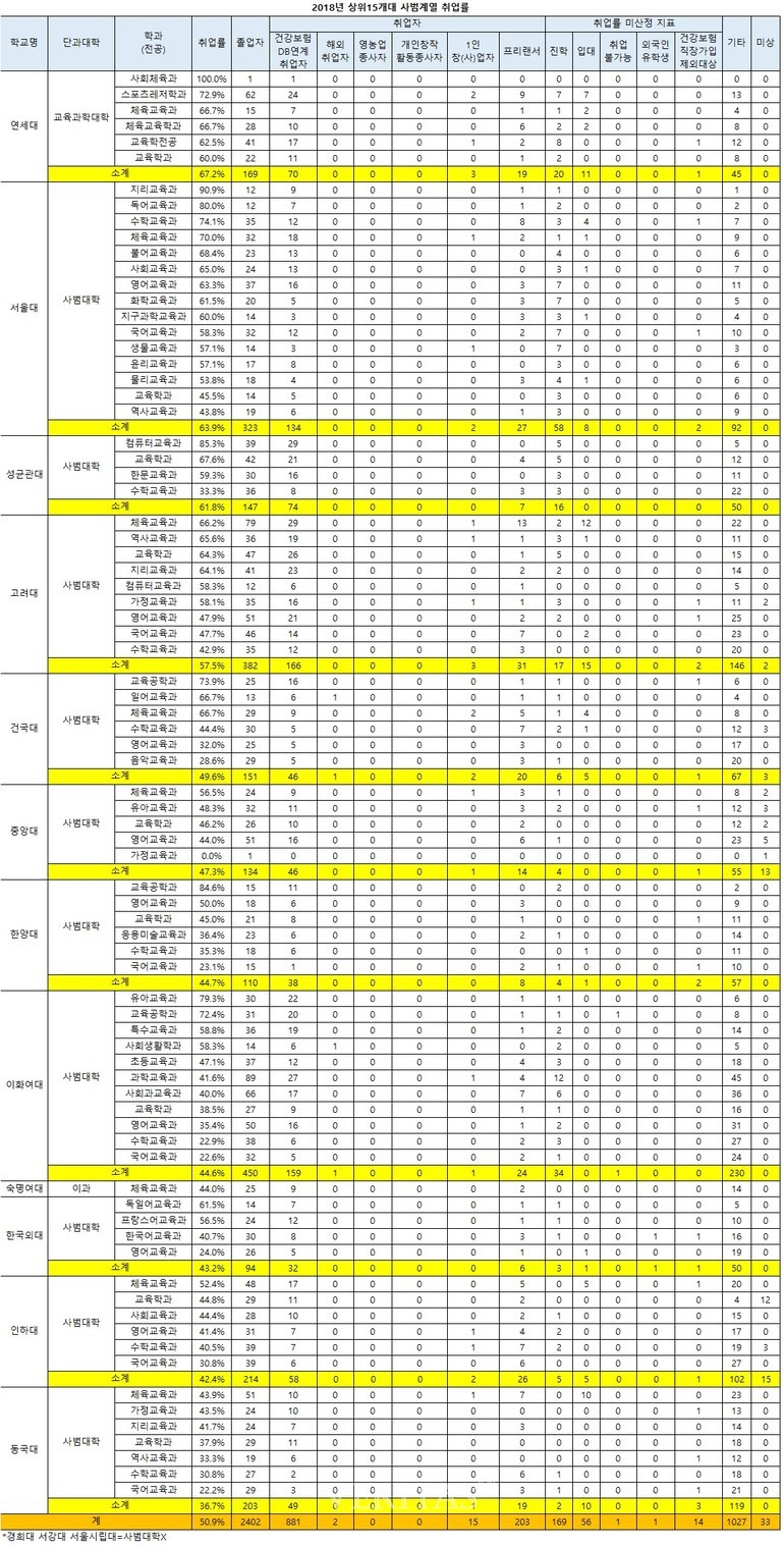 <상위15개대 계열별 취업률 사범 50.9%>