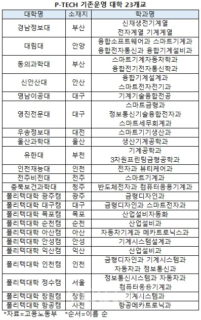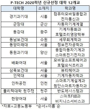 올해 선정결과에서는 전문대학의 비율이 높았다. 기존 운영하던 23개교 중 전문대학이 12개교, 폴리텍대학이 11개교로 비슷한 수준이었지만, 2020년 선정대학에는 12개교 중 11개교가 전문대학으로 압도적으로 많았다. 기존 운영 중인 전문대학은 경남정보대 대림대 동의과학대 신안산대 영남이공대 영진전문대 우송정보대 울산과학대 유한대 인천재능대 전주비전대 충북보건과학대 12개교다. 폴리텍대학의 경우 캠퍼스별로 선정이 이뤄져, P-TECH운영 중인 캠퍼스는 광주 대구 목포 순천 아산 안성 익산 인천 정수 창원 항공캠퍼스다.