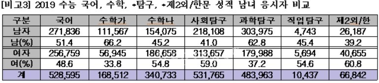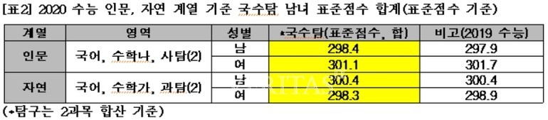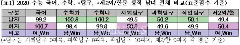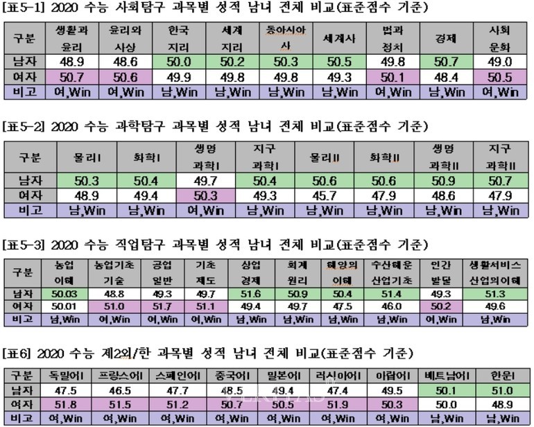 2020수능의 국어 수학 탐구(사탐/과탐/직탐) 제2외국어/한문 성적의 남녀 비교 결과, 전체 표준점수 평균 성적으로는 수학가형(100.8점), 수학나형(100.2점), 과학탐구(50.2점), 직업탐구(50.1점) 영역은 남학생이 높았고, 여학생은 국어(100.7점), 사회탐구(50.3점), 제2외국어/한문(50.4점) 영역에서 높은 것으로 나타났다.