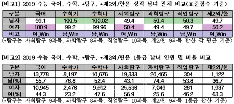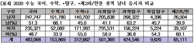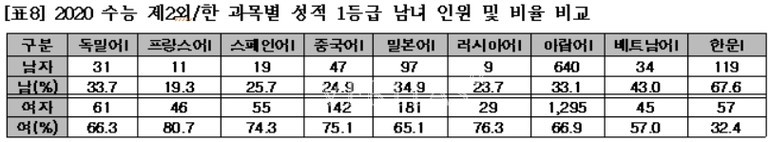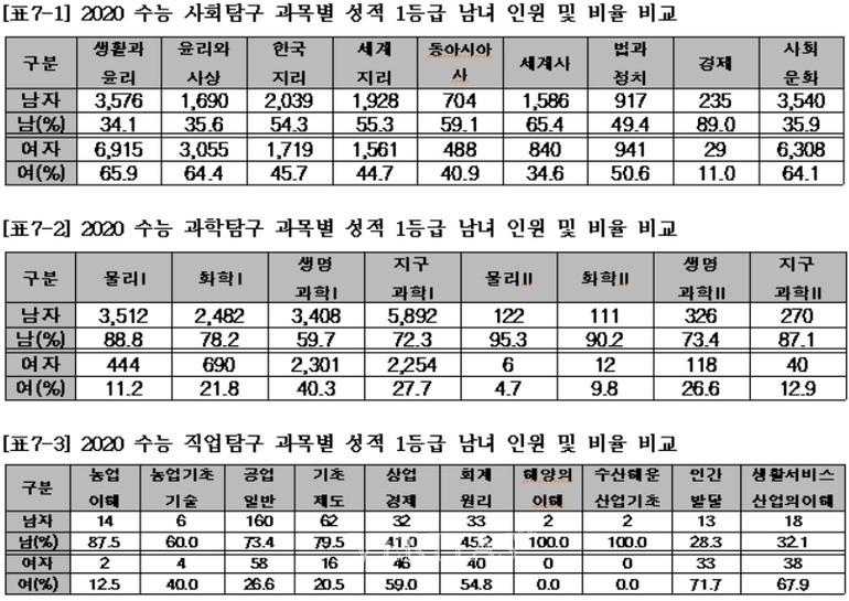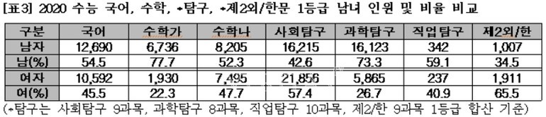 2020수능 1등급의 남녀 인원 및 비율 비교 결과, 국어(54.5%), 수학가형(77.7%), 수학나형(52.3%), 과학탐구(73.3%), 직업탐구(59.1%) 영역은 남학생이 많았고, 여학생은 사회탐구(57.4%), 제2외국어/한문(65.5%) 영역에서 높았다.