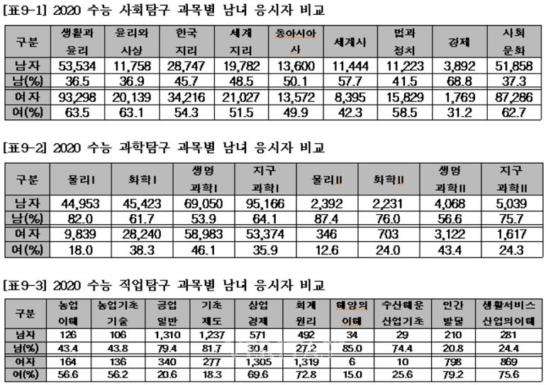 2020수능 탐구(사탐/과탐/직탐) 영역 및 제2외국어/한문 영역의 응시 과목별로는 사회탐구 영역에서 한국지리(50.0), 세계지리(50.2), 동아시아사(50.3), 세계사(50.5), 경제(50.7) 등 5과목은 남학생 성적이 높았고, 생활과윤리(50.7), 윤리와사상(50.6), 법과정치(50.1), 사회문화(50.5) 등 4과목은 여학생이 높았다.