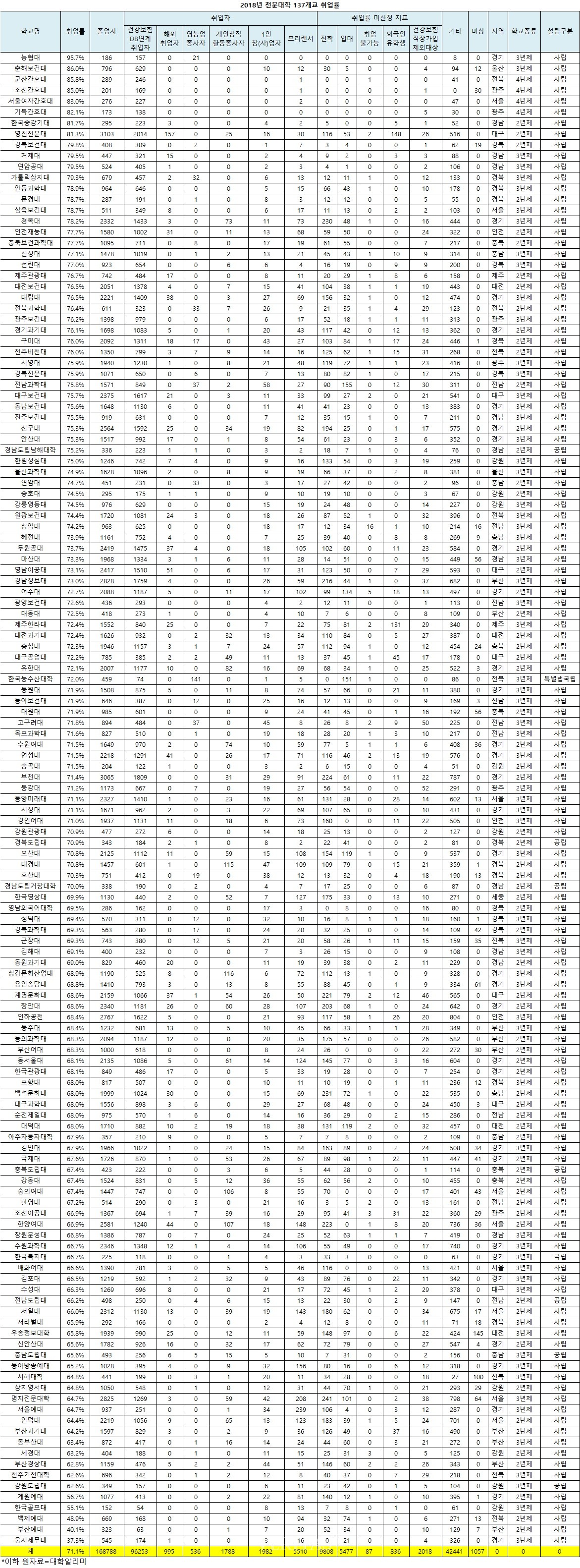 기능대학을 제외한 137개 전문대학의 평균 취업률은 71.1%로 나타났다. 전체 16만8788명의 졸업자에서 취업률 미산정지표 1만8226명을 제외한 15만562명 중 10만7064명이 취업한 것으로 나타났다. 2018년 기준 취업률이 가장 높은 곳은 농협대다. 95.7%로, 137개 전문대학 중 유일하게 90%를 넘기는 취업률이었다. 춘해보건대(86%) 군산간호대(85.8%) 순으로 톱3였다. 톱3에 이어 조선간호대(85%) 서울여자간호대(83%) 기독간호대(82.1%) 순으로, 간호대의 취업률이 높게 나타난 특징이다.