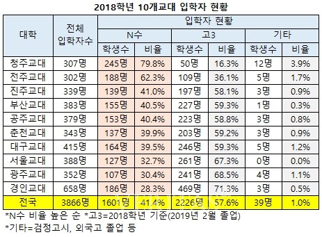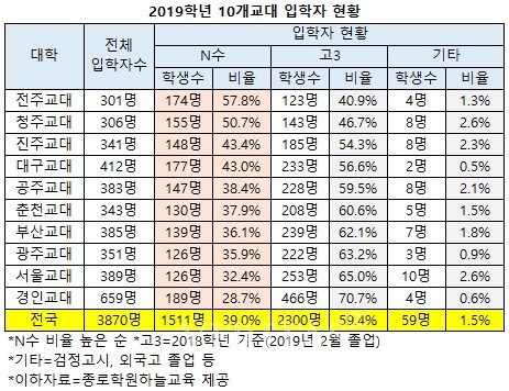 대학별로는 전주교대가 2019학년 N수생 비율이 57.8%로 가장 높았다. 전체 입학생 301명 가운데 N수생이 174명이었다. 이어 청주교대50.7%(306명/155명) 진주교대43.4%(341명/148명) 대구교대43%(412명/177명) 공주교대38.4%(383명/147명) 춘천교대37.9%(343명/130명) 부산교대36.1%(385명/139명) 광주교대35.9%(351명/126명) 서울교대32.4%(389명/126명) 경인교대28.7%(659명/189명) 순이었다. 2018학년의 경우 청주교대가 80%에 육박하는 N수생 비율을 보이기도 했다. 전체 입학자 307명 가운데 245명이 N수생으로 79.8%의 비율이었다. 전주교대62.3%(302명/188명) 진주교대41%(339명/139명) 순으로 뒤를 이었다.