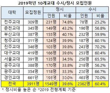 N수생 비율이 대학별로 크게 다른 이유는 수시와 정시 모집인원의 차이 때문이다. N수생의 합격비율은 수능중심의 정시선발 비중이 클수록 높아지는 것이 일반적이다. 반면 학생부중심인 수시선발이 많은 교대에선 상대적으로 N수생 비율이 낮은 편이다. 예를 들어 전주교대는 2019학년 전체 모집정원 309명 가운데 74.8%인 231명을 정시로 선발했다. 입학자 중 N수생의 비율도 10개교대중 가장 높게 나타났다. 반면 경인교대는 2019학년 모집정원 661명 가운데 70%인 463명을 수시로 모집했다. 정시선발인원은 30%인 198명에 불과했다. 결과적으로 N수생의 비율도 10개교대 중 가장 낮은 28.7%에 불과했다. 반대로 고3 재학생은 466명이 입학해 70.7%의 비중을 차지했다. 상대적으로 학생부 성적이 우수한 고3 학생들이 다수 합격한 것으로 볼 수 있다.