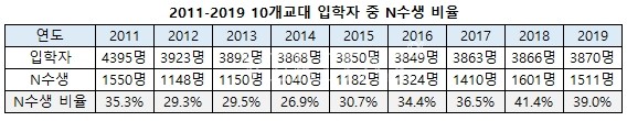 [베리타스알파=손수람 기자] 2019학년 전국 10개교대 전체 입학자 가운데 N수생의 비율이 39%에 달하는 것으로 나타났다. 종로학원하늘교육(이하 종로하늘)은 전국의 10개교대 입학자 3870명 가운데 N수생이 1511명으로 39%의 비중을 차지했다고 22일 밝혔다. 2018학년의 41.4%(입학자3866명/N수생1601명)보다는 다소 낮아졌지만 최근 9년 사이 두 번째로 높은 결과였다. 대입에서 수시비중이 늘면서 그동안 주춤했던 졸업생 입학자의 비율은 2015학년 이후 수능 재수생 강세에 힘입어 정시를 중심으로 다시 늘고 있다고 분석된다.