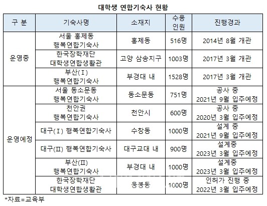 지난해 4월1일 기준 기숙사 수용률은 수도권의 경우 17.5%에 그쳐 전국 평균 22.2%에 미치지 못하는 상태다. 비수도권은 이보다 더 높은 25.5%다. 현재 운영중인 수도권 연합기숙사는 홍제동과 삼송지구에 위치한다. 2014년 8월 개관한 홍제동 기숙사는 516명 규모이며, 2017년 3월 개관한 삼송지구는 1003명 규모다.