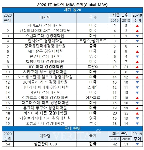 [베리타스알파=권수진 기자] 영국 파이낸셜 타임즈(FT)가 선정하는 ‘2020 풀타임 MBA 순위(FT Global MBA ranking 2020)’에 성균관대 GSB가 54위로 이름을 올렸다. 국내대학 중 유일하게 2012년부터 9년째 100대 MBA에 선정된 쾌거다. 2016년 69위, 2017년 54위, 2018년 51위, 2019년 42위로 3년 연속 상승세였다가 2020년 54위로 다소 내려앉은 점은 아쉬운 대목이다.