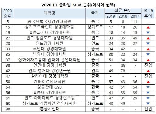 올해도 아시아 톱은 중국의 중국유럽국제경영대학원이다. 이어 싱가포르국립대 경영대학원(15위) 홍콩과기대 경영대학원(19위) 인도 뱅갈로르 경영대학원(27위) 인도경영대학원(28위) 푸단대 경영대학원(33위) 난양대 경영대학원(35위) 상하이자오퉁대 안타이 경영대학원(37위) 인민대 경영대학원(38위) 인도 캘커타 경영연구원(42위) 상하이대 경영대학원(47위) CUHK 경영대학원(50위) 성균관대 GSB(54위) 홍콩대 경영대학원(56위) 인도 아메다바드 경영연구원(61위) 싱가포르 리콩치안 경영대학원(63위) 홍콩시립대(98위) 순이었다.