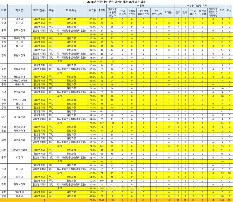 임상병리과 모집대학은 전국 27개교이나, 수원과학대는 2020학년 임상병리과를 신설해, 2018년 기준 취업률 통계에는 포함되지 않았다. 대학알리미가 공시한 2019 ‘졸업생의 취업현황’은 2018년 12월31일 기준이다. 2017년 8월, 2018년 2월 졸업자가 조사 대상이다.