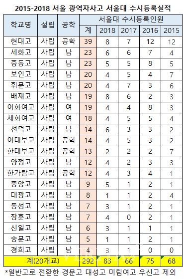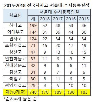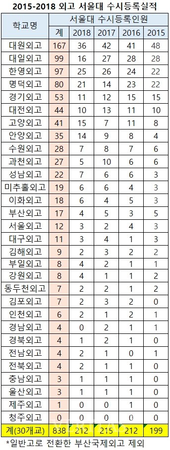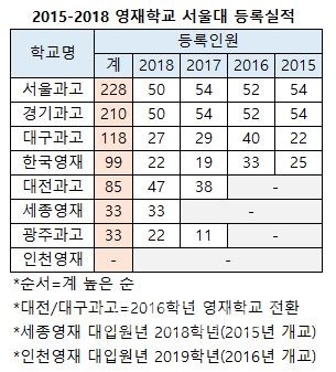 2018학년까지 공개된 등록실적의 경우, 2015학년부터 2018학년까지도 대원외고가 수시등록자를 최다 배출한 것으로 확인됐다. 2018학년 36명, 2017학년 42명, 2016학년 41명, 2015학년 48명으로 총 167명이다. 이어 대일외고99명(2018학년 16명/2017학년 27명/2016학년 28명/2015학년 28명) 한영외고97명(25명/26명/24명/22명) 명덕외고80명(21명/14명/23명/22명) 경기외고53명(11명/12명/15명/15명) 대전외고44명(10명/13명/11명/10명) 고양외고41명(15명/7명/11명/8명) 안양외고35명(14명/9명/8명4명) 수원외고28명(7명/8명/7명/6명) 과천외고27명(5명/10명/6명/6명) 성남외고22명(7명/6명/6명/3명) 미추홀외고19명(6명/6명/4명/3명) 이화외고18명(6명/4명/5명/3명) 부산외고17명(4명/5명/3명/5명) 서울외고12명(3명/2명/4명/3명) 대구외고11명(3명/4명/1명/3명) 김해외고9명(2명/3명/2명/2명) 부일외고8명(4명/2명/1명/1명) 강원외고8명(4명/1명/1명/2명) 동두천외고7명(2명/2명/1명/2명) 김포외고7명(2명/3명/2명/0명) 인천외고6명(2명/1명/2명/1명) 경남외고4명(0명/2명/1명/1명) 경북외고4명(1명/2명/1명/0명) 전남외고4명(2명/1명/0명/1명) 전북외고4명(2명/1명/1명/0명) 충남외고3명(1명/1명/1명/0명) 울산외고3명(1명/1명/1명/0명) 제주외고1명(0명/0명/1명/0명) 순이다.