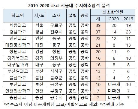 조사된 9개과고 중 2020학년 서울대 수시 최초합격자가 가장 많이 배출된 곳은 세종과고(20명)였다. 이어 경남과고(14명) 인천과고(12명)창원과고(11명) 대전동신과고(8명) 대구일과고(8명) 부산일과고(7명) 경기북과고(6명) 울산과고(4명) 순이다. 2019학년의 경우 12개교가 조사됐고 경남과고가 23명으로 가장 많았다. 이어 세종과고(19명) 대전동신과고(13명) 인천과고(11명) 부산과고(10명) 경기북과고(10명) 창원과고(9명) 울산과고(9명) 대구일과고(8명) 충남과고(7명) 인천진산과고(7명) 부산일과고(6명) 순이었다.