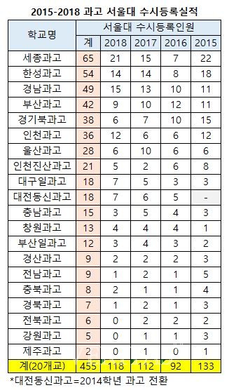 2018학년까지 공개된 등록실적의 경우, 2015학년부터 2018학년까지 세종과고가 수시등록자를 최다 배출한 것으로 확인됐다. 2018학년 21명, 2017학년 15명, 2016학년 7명, 2015학년 22명으로 총 65명이다. 이어 한성과고54명(2018학년 14명/2017학년 14명/2016학년 8명/2015학년 22명) 경남과고49명(15명/13명/10명/11명) 부산과고42명(9명/10명/12명/11명) 경기북과고38명(6명/7명/10명/15명) 인천과고36명(12명/6명/6명/12명) 울산과고28명(6명/10명/6명/6명) 인천진산과고21명(5명/2명/6명/8명) 대구일과고18명(7명/5명/3명/3) 대전동신과고18명(7명/6명/5명/-) 충남과고15명(3명/5명/4명/3명) 창원과고13명(4명/4명/4명/1명) 부산일과고12명(3명/4명/4명/2명) 경산과고9명(2명/2명/2명/3명) 전남과고9명(1명/2명/1명/5명) 충북과고8명(2명/1명/1명/4명) 경북과고7명(1명/2명/1명/3명) 전북과고6명(0명/2명/2명/2명) 강원과고5명(0명/1명/1명/3명) 제주과고2명(0명/1명/0명/1명) 순이다. 대전동신과고의 경우 2014학년부터 과고로 전환돼 대입원년은 2016학년부터다.