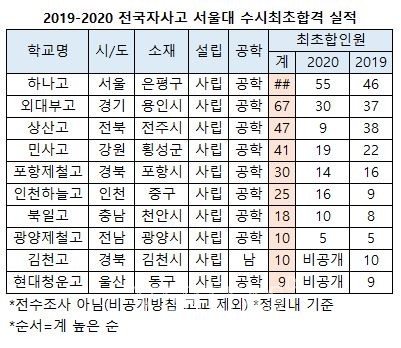 2020학년 서울대 수시 최초합격자 조사가 진행된 8개교 중 실적이 가장 좋은 곳은 하나고였다. 55명의 실적으로 전국에서도 가장 많았다. 이어 외대부고30명 민사고19명 인천하늘고16명 포항제철고14명 북일고10명 상산고9명 광양제철고5명 순이었다. 2019학년 수시 최초합격자 실적에서도 하나고가 46명으로 가장 많았다. 이어 외대부고37명 상산고38명 민사고22명 포항제철고16명 인천하늘고9명 북일고8명 광양제철고5명 김천고10명 현대청운고9명 순이다.