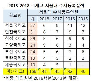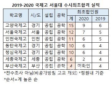2020학년 서울대 수시 최초합격자 조사가 진행된 6개교 중 실적이 가장 높은 곳은 고양국제고다. 9명의 실적이다. 이어 서울7명 동탄6명 인천6명 청심6명 세종2명 순이다. 7개교 모두 실적이 조사된 2019학년 수시 최초합격자 실적에서도 고양국제고가 6명으로 가장 많았다. 이어 서울과 인천 각 5명, 동탄 부산 세종 청심 각 4명 순이다. 2018학년까지 공개된 등록실적의 경우, 2015학년부터 2018학년까지는 서울외고가 수시등록자를 최다 배출한 것으로 확인됐다. 2018학년 6명, 2017학년 8명, 2016학년 11명, 2015학년 12명이다. 이어 서울37명(6명/8명/11명/12명) 인천31명(8명/7명/9명/7명) 청심29명(5명/6명/9명/9명) 고양24명(9명/8명/3명/4명) 부산24명(5명/6명/7명/6명) 동탄13명(4명/5명/2명/2명) 세종10명(4명/5명/1명/-) 순이다. 세종의 경우 2013년 개교해 2016학년이 대입원년이다.