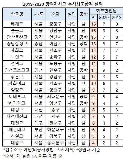 2020학년 서울대 수시 최초합격자 조사가 진행된 15개교 중 실적이 가장 좋은 곳은 부동의 1위 대원외고다. 35명의 실적이었다. 이어 대일외고26명 명덕외고20명 한영외고21명 고양외고17명 경기외고12명 안양외고13명 대전외고10명 성남외고10명 과천외고9명 부산외고7명 미추홀외고6명 서울외고7명 강원외고4명 수원외고4명 순이다. 2019학년 수시 최초합격자 실적에서도 대원외고가 32명으로 가장 많았다. 이어 대일외고22명 명덕외고22명 한영외고14명 경기외고11명 대전외고11명 안양외고10명 고양외고9명 성남외고8명 과천외고7명 부산외고7명 이화외고7명 미추홀외고6명 강원외고4명 서울외고2명 순이다.