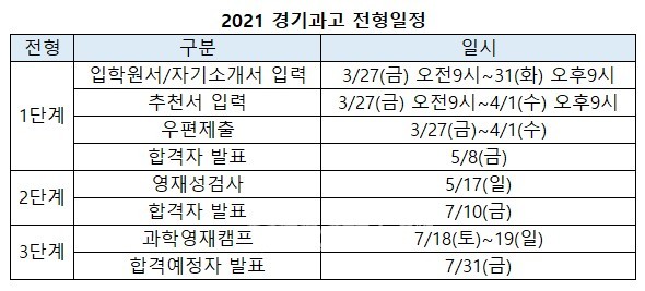 3일 경기과고가 공개한 2021학년 입학 전형요강에 따르면 올해도 모집인원은 정원내 일반전형 120명이다. 정원외로는 추천관찰전형으로 정원의 10%인 12명 이내를 모집한다. 중학교 재학생과 졸업생, 이에 상응하는 자격을 갖춘 자 가운데 학교장이나 지도교사의 추천을 받은 자라면 전국 어디에서나 지원할 수 있다.