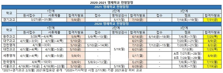 영재학교 대부분이 3월 말에서 4월 초 요강을 공개한다. 올해의 경우 경기과고가 3일 2021학년 모집요강을 공개해 8개교 중 유일하게 모집요강이 먼저 공개됐다. 경기과고의 모집인원 전형방법 등은 전년과 동일했지만 1단계 서류평가 선발규모의 제한이 삭제됐다. 2020학년의 경우 2단계 영재성검사 대상자(1단계 서류평가 합격자)를 일반800명, 추천관찰60명내외로 인원에 제한을 뒀지만, 2021학년에는 1단계 서류평가 선발규모 인원을 밝히지 않고 ‘영재성이 높다고 판단되는 자’로 표기했다. 선발인원에 제한을 두지 않고 서류전형에서 영재성이 높은 인원을 모두 선발하겠다는 의미로 받아들여진다. 나머지 7개교는 모집요강이 공개되지 않았지만, 서울과고는 지난해 12월 의대진학 억제방안과 함께 지역인재 우선선발인원 확대를 예고한 상황이다. 41개 단위지역별(16개시도/서울25개자치구)에서 1명 이내로 선발하던 범위가, 2021학년부터는 2명까지 우선 선발하도록 확대된다.