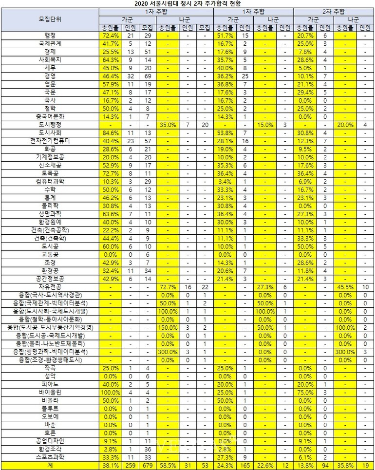 가군에서는 바이올린이 100%(추합4명/모집4명)로 최고충원율을 기록했고, 나군에서는 3명을 모집한 융합(생명과학-빅데이터분석)이 300%로 최고충원율이었다. 인문계열 최상위 모집단위인 경영은 69명 모집에 32명이 추합해 46.4%의 2차충원율을 기록했다. 시립대 특성화학과인 세무는 20명 모집에 9명이 추합해 2차충원율이 45%였다.