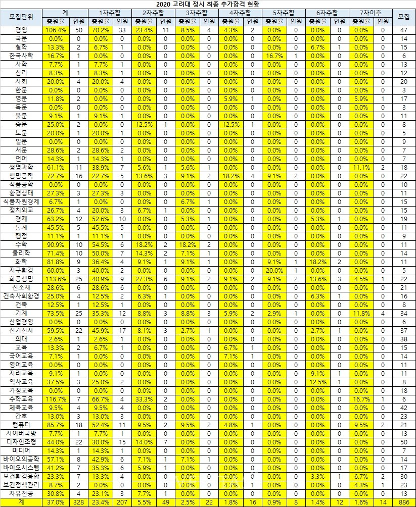 [베리타스알파=권수진 기자] 고려대는 2020정시에서 37%의 최종충원율을 기록했다. 총 모집인원 886명 중 328명이 추합했다. 1차 207명, 2차 49명, 3차 22명, 4차 16명, 5차 8명, 6차 12명, 7차 이후 14명이다.