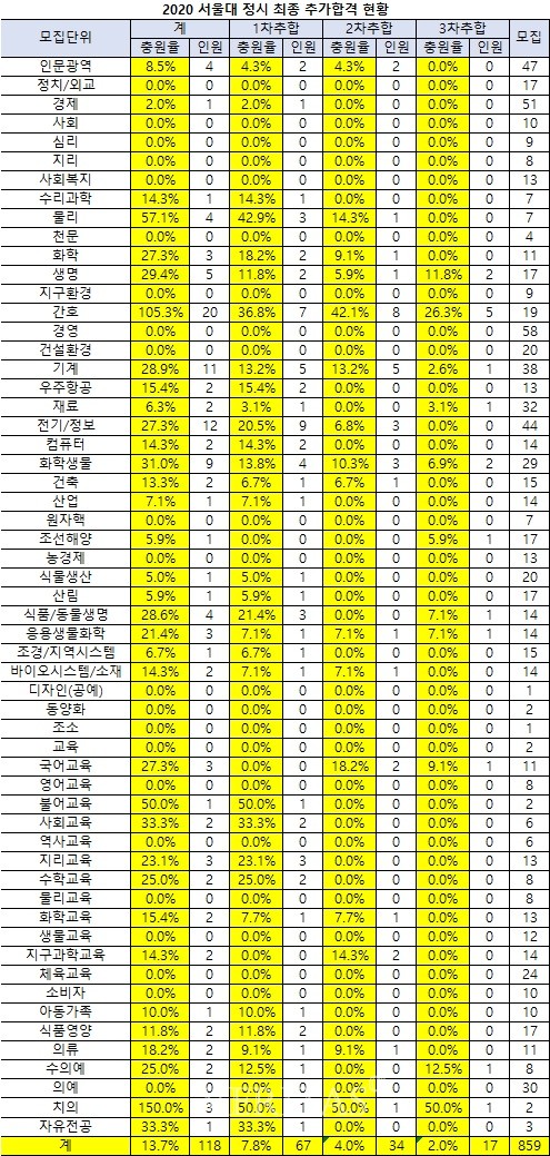 치의예에 이어 간호가 105.3%(1차7명/2차8명/3차5명/모집19명)로 한 바퀴를 넘는 충원율이었다. 물리57.1%(3명/1명/0명/7명) 불어교육50%(1명/0명/0명/2명) 사회교육33.3%(2명/0명/0명/6명) 자유전공33.3%(1명/0명/0명/3명) 화학생물31%(4명/3명/2명/29명) 생명29.4%(2명/1명/2명/17명) 기계28.9%(5명/5명/1명/38명) 식품/동물생명28.6%(3명/0명/1명/14명) 국어교육27.3%(0명/2명/1명/11명) 전기/정보27.3%(9명/3명/0명/44명) 화학27.3%(2명/1명/0명/11명) 수의예25%(1명/0명/1명/8명) 수학교육25%(2명/0명/0명/8명) 지리교육23.1%(3명/0명/0명/13명) 응용생물화학21.4%(1명/1명/1명/14명) 순으로 20%를 넘는 충원율이었다.