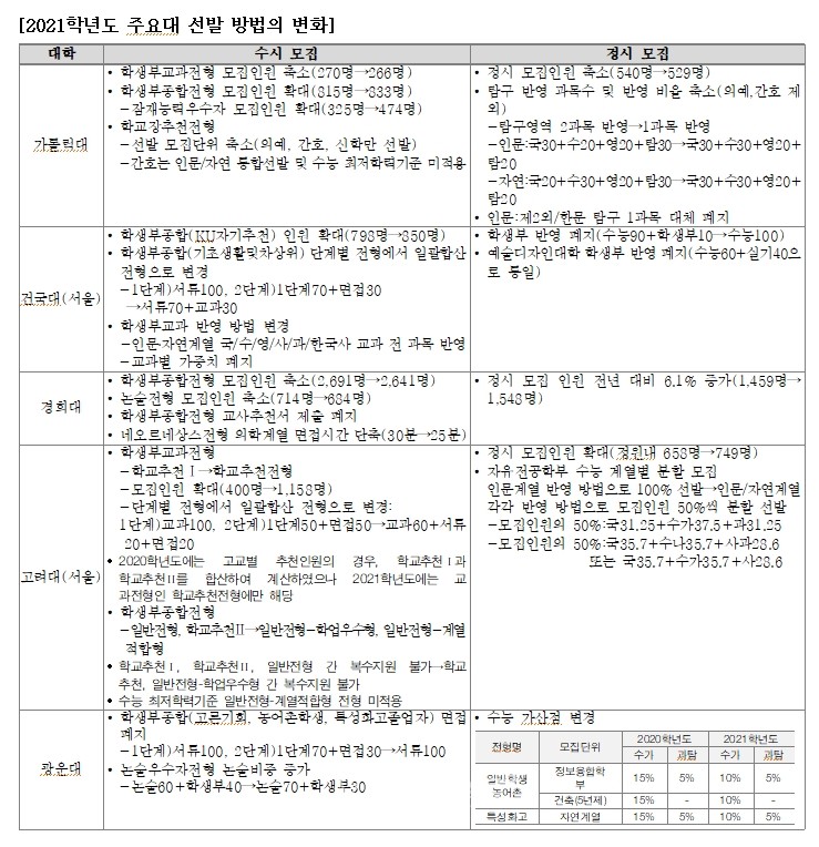 그 밖에도 2020학년과 비교해 2021학년에는 대학별로 전형 유형 및 전형 방법 등에 변화가 많으므로 반드시 변경 사항을 체크하여 대비하는 것이 필수다. 건국대는 학생부 반영 방법이 변경돼 교과별 가중치를 폐지하였으며, 정시모집에서는 학생부 반영을 폐지하고 수능 성적으로만 선발한다.