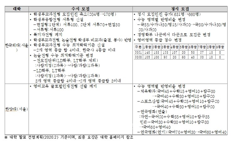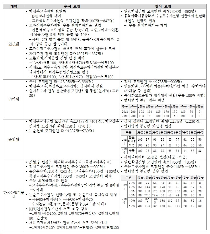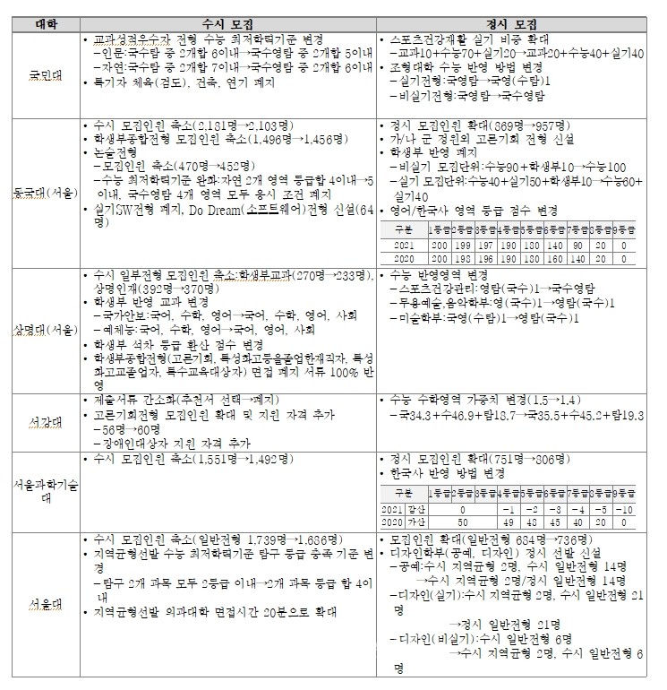 국민대는 교과성적우수자 전형의 수능최저를 국수탐 중 2개영역 6등급 이내(자연 7등급 이내)에서 국수영탐 중 2개영역 5등급 이내(자연 6등급 이내)로 변경하여 영어 영역을 포함시켰다. 동국대 논술 전형은 자연계열의 경우 2020학년에는 수능 2개영역 등급 합이 4등급 이내여야 최종 합격이 가능했으나 올해에는 5등급 이내로 수능최저를 완화했다.