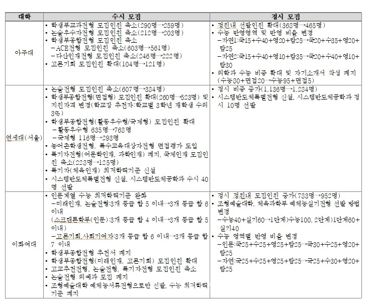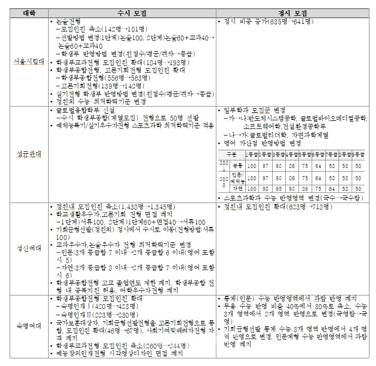 고려대 학생부교과전형은 단계별 전형에서 일괄합산 전형(교과60+서류20+면접20)으로 선발 방법을 변경했다. 동국대는 실기SW전형을 폐지하고 Do Dream(소프트웨어)전형을 신설해 64명을 선발하며, 정시 모집 수능 영어/한국사 등급 점수를 변경했다. 성균관대는 계열별로 달리 적용하던 영어 가산점을 전 계열 공통으로 동일하게 적용하며, 스포츠과학과의 경우 수능 국수 반영에서 국수탐 반영으로 변경하였다. 그 밖에도 숙명여대, 아주대, 이화여대 등 주요대에서 수능 영역별 반영 비율을 변경하는 등 각 대학별로 모집 시기별 전형 유형 및 선발 방법 등에 변화가 크므로 반드시 지원하고자 하는 대학/학과의 변화를 체크하여 대비하도록 하자.