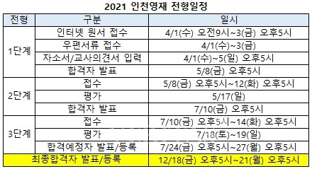 2단계를 합격한 3단계 대상자들도 마찬가지로 접수를 해야 한다. 접수 기간은 7월10일 오후5시부터 14일 오후5시까지다. 평가는 7월18일부터 19일까지 인천영재에서 1박2일간 진행된다. 합격예정자는 7월24일 오후5시 원서접수 사이트를 통해 발표한다. 최종합격자는 12월18일 오후5시 합격예정자와 동일하게 원서접수 사이트에서 공개한다.