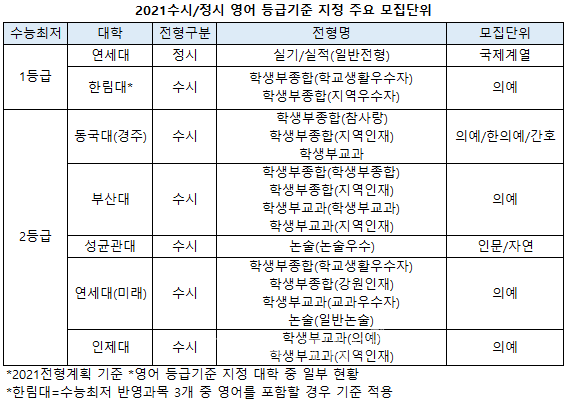 2021대입에서 영어 1등급 기준을 적용하는 대학은 연세대와 한림대다. 상위권 수험생들은 연대 국제계열을 정시 실기/실적(일반)으로 지원할 경우 영어1등급이 필수인 점을 염두에 두어야 한다. 나머지 국어 수학(나) 사/과탐(2과목) 4개영역 등급합 7이내, 또는 국어 수학(가) 사/과탐(2과목) 등급합 8이내를 충족해야 한다. 한국사는 4등급을 만족해야 한다. 한림대 의예도 조건에 따라 영어1등급 기준이 적용된다. 수능최저는 국어 수학(가) 영어 과탐(2과목평균) 가운데 3개영역 등급합이 4이내여야 한다. 이 가운데 영어를 포함할 경우 반드시 1등급을 받아야 한다. 2등급 이하의 성적일 경우엔 국어 수학 과탐 성적만 반영할 수 있는 셈이다.