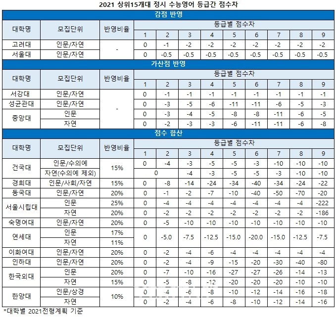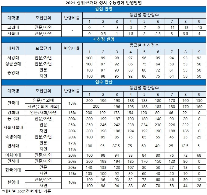 정시에서 영어를 반영하는 방법은 대학별로 차이가 있다. 수능에서 다른 과목에 비해 영어의 영향력이 축소되는 흐름도 나타난다. 영어가 절대평가로 전환된 영향이다. 반영방식은 감점 혹은 가산점을 부여하거나 등급별 점수를 환산해 총점에 합산하는 두 가지 방식으로 나뉜다. 등급간 점수격차나 영어 반영비율이 대학별로 상이하기 때문에 수험생들은 본인에게 유리한 조합을 고민해봐야 한다.