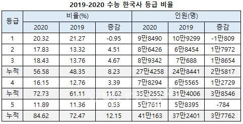 2020수능에서 한국사 1등급 비율은 20.32%로 지난해 21.27%에 비해 소폭 줄었다. 그렇지만 2등급 비율은 13.32%에서 17.83%로, 3등급 비율은 13.76%에서 18.43%로 각각 크게 늘어났다. 3등급까지 누적 비율이 절반을 넘긴 56.58%로 나타난 셈이다. 4등급까지 누적비율도 72.73%였다. 2017년 이후 난이도가 상대적으로 낮아지고 있는 경향이 유지되고 있어 수능최저의 부담이 크지는 않은 것으로 분석된다. 그렇지만 올해 역시 쉽게 출제되리라는 보장은 없는 만큼 어느 정도 대비가 필요하다.
