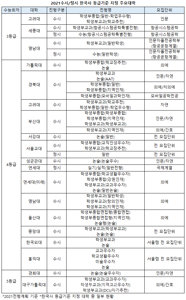 한국사의 경우 3등급을 기준으로 제시한 대학들이 눈에 띈다. 고대 세종대 영남대의 3개교다. 수험생들은 30점이상이어야 수능최저를 충족한다. 고대의 수시전형인 학종(일반-학업우수형)과 교과(학교추천)은 인문 모집단위에 한해 3등급을 기준으로 적용한다. 한국사를 포함한 수능최저는 학종의 경우 국어 수학(가/나) 영어 사/과탐 등급합 6이내, 교과는 국어 수학(가/나) 영어 사/과탐 중 3개 등급합 5이내다.