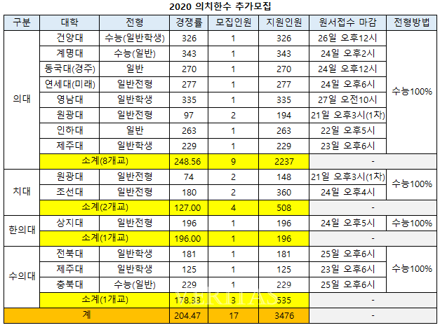 <2020추가모집 의치한수.. 합산경쟁률 204.47대1>